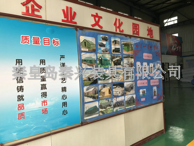 秦皇島秦興裝具有限公司有限公司源于我國第3524工廠,創建于2005年,占地面積30畝,是一家致力于研究,發展,制造和銷售為一體的綜合性裝具及紡織服裝加工生產企業,我們的主要產品有單、棉帳篷,民用帳篷,旅游帳篷集各種機工產品等。